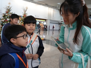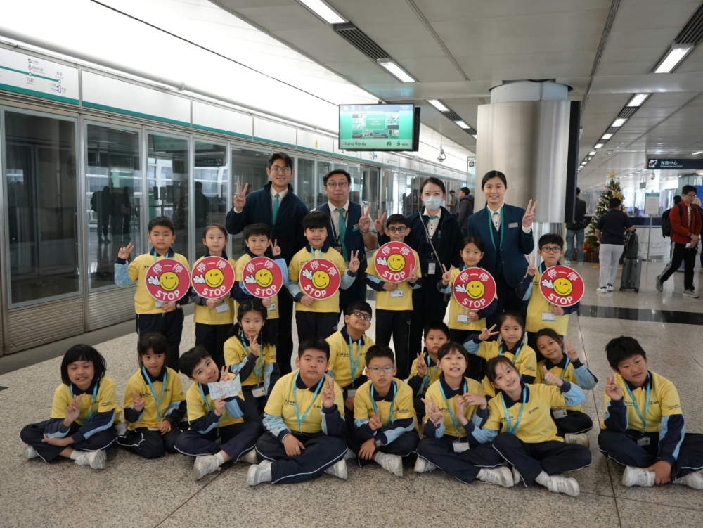 同學們穿上「港鐵小站長」制服,肩負使命,在港鐵機場站向乘客宣傳鐵路安全信息,