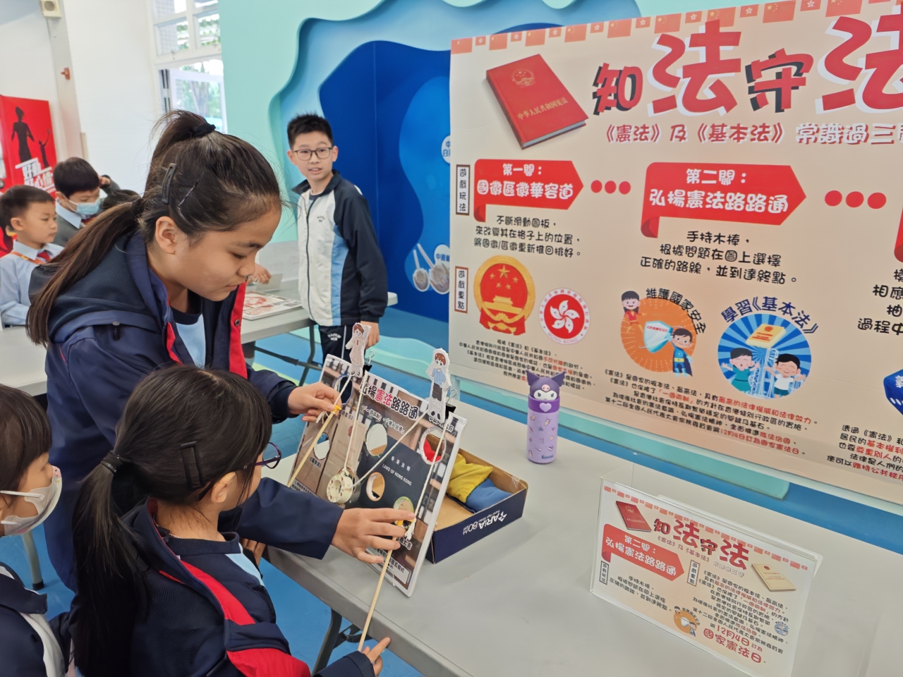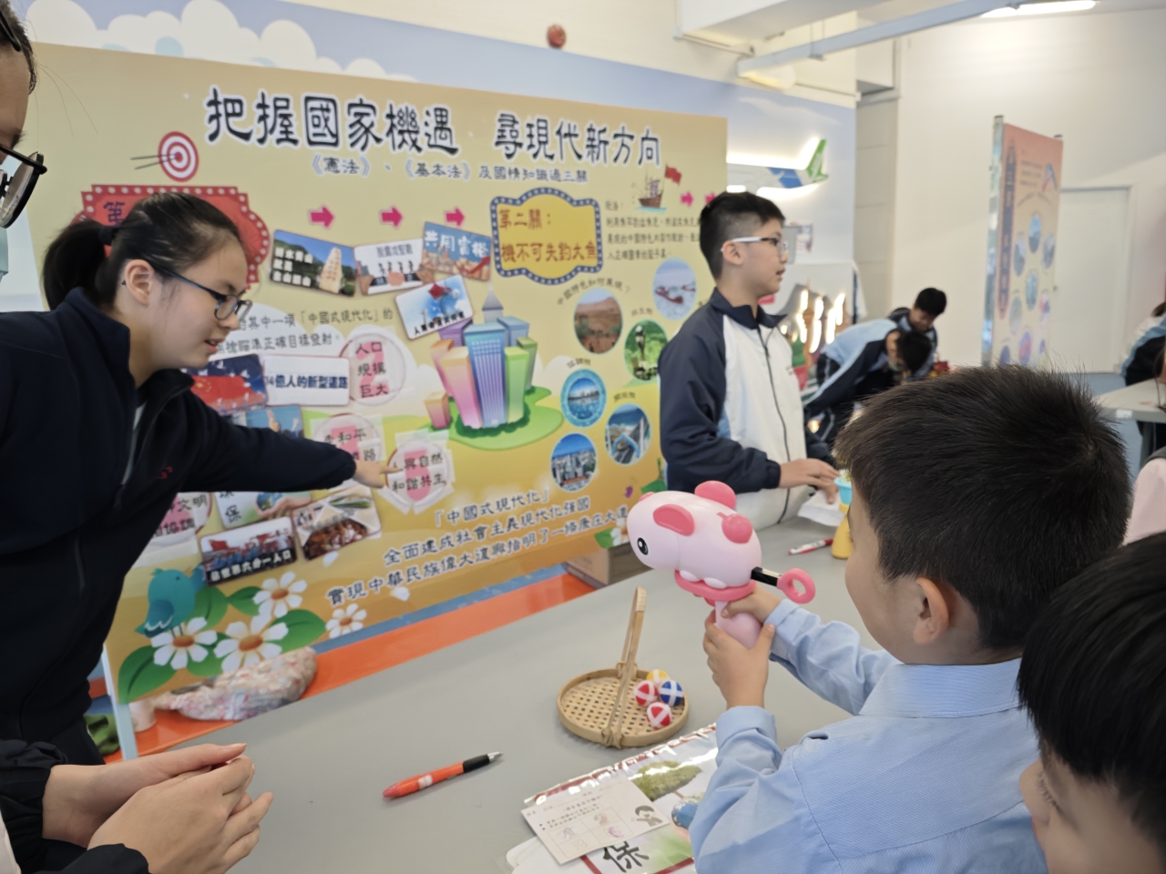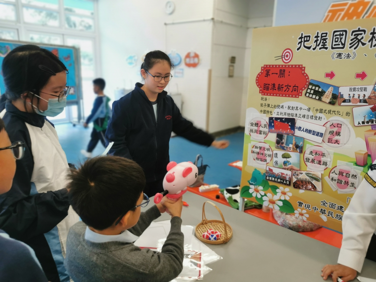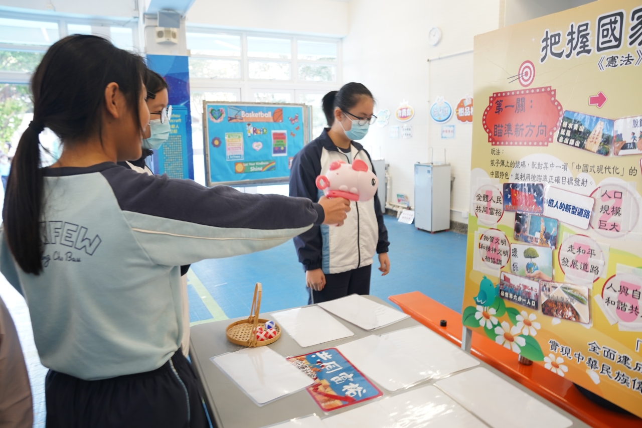 為迎接本年第十一個「國家憲法日」,本校安排《憲法》及《基本法》學生校園大使參加由教育局舉辦之2024「國家憲法日」攤位遊戲設計比賽,並帶領全校學生一同參與攤位遊戲,從遊戲中學習,以推動學生維護憲法權威的觀念,培養學生的國民身份認同。