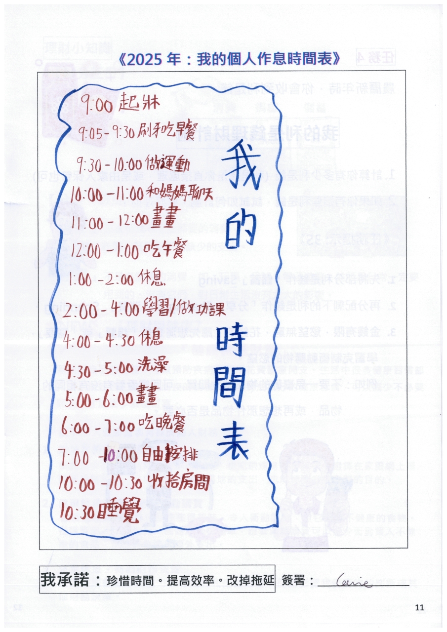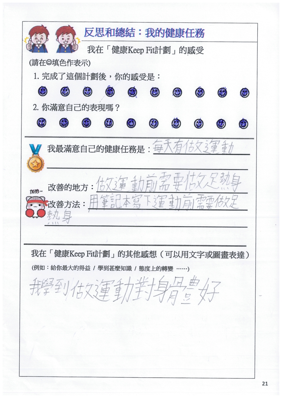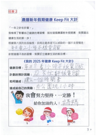 為了提升學生的自我管理能力及培養健康的生活態度和習慣,本校安排學生在農曆年假期間進行「新春健康Keep Fit學習計劃」,旨在讓學生檢視個人的生活習慣、進行個人的生活時間表的規劃修訂,並自訂及持之以恆地完成健康目標,建立健康的生活方式。假期後,學生需將完成的計劃冊及記錄內容交回班主任,並與老師和同學分享經歷。