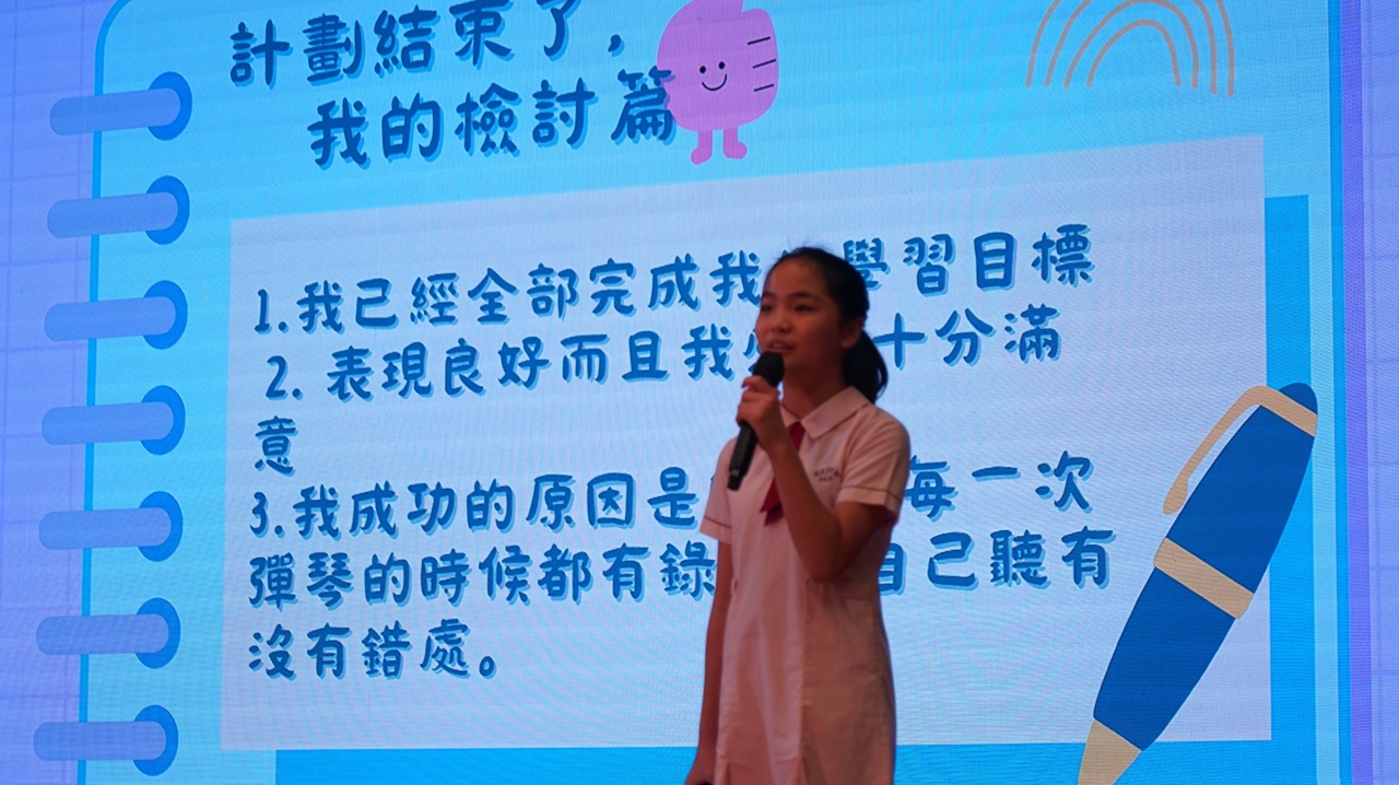 「暑假自主學習計劃」的目標是鼓勵同學善用課餘時間,提升自我管理能力,並培養自主學習的精神。暑假過後,大家帶着自己的學習計劃回到校園,在班內分享訂立目標和記錄過程的經驗。表現特別出色的同學更走上禮堂舞台,向全校師生展示成果。透過這些分享,大家能互相觀摩、交流心得,從彼此的做法中得到啟發,學到更多不同的學習策略。