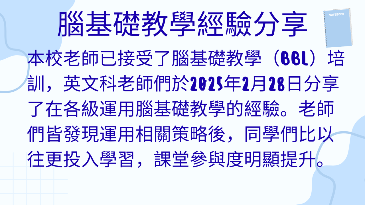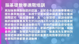 為提升學與教的質素,本校教師在不同的科目上積極發展校本課程。在是次課程發展和小班教學計劃的分享會中,大家也樂於分享與交流,體現了本校教師具持續專業發展的精神。