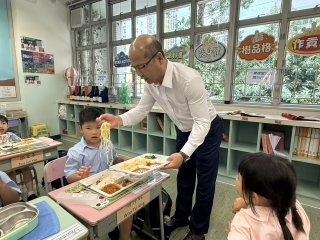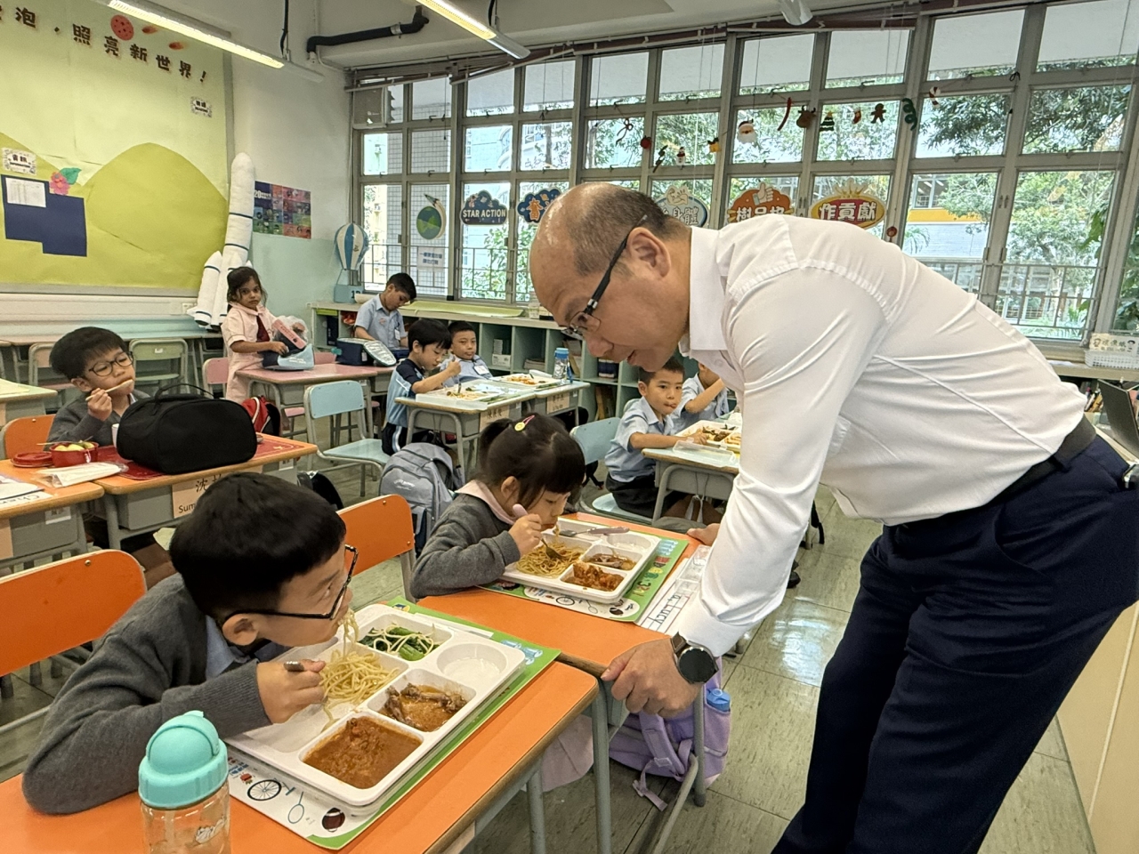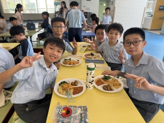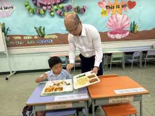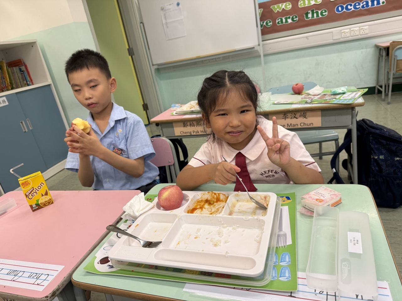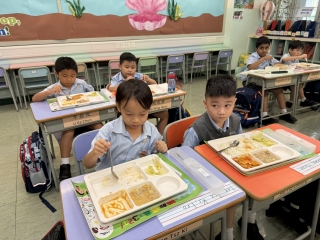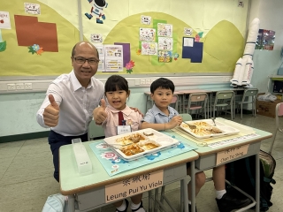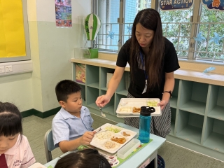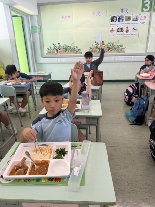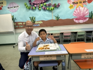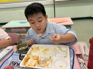 本校今年實行「惜飲惜食」計劃,目的是希望學生能珍惜食物。計劃實行了一星期,透過老師的觀察,同學們均能珍惜食物,即使是一年級的學生,也能積極參與。家長義工們的協助,令計劃順利展開。今天,黃校長還特意到各個課室及飯堂巡視,了解學生午膳情況,並為學生「添飯」呢!