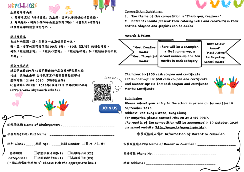 我們誠邀全港幼稚園學生一齊發揮藝術小宇宙,用色彩與創意,向敬愛的老師送上最真摯的祝福!