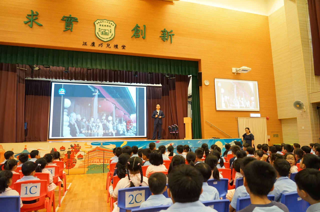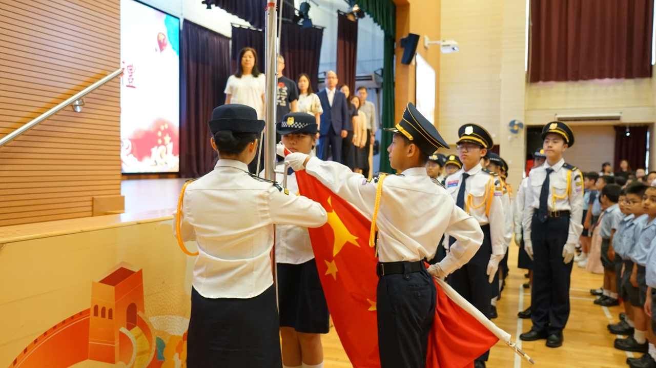 為慶祝祖國76周年華誕及提升學生的國家觀念與國民身份認同,本校於9月30日舉行了「國慶升旗禮」。活動在莊嚴的升旗儀式中拉開序幕。黃校長隨即發表了「國旗下的講話」,不僅加深了同學們對國慶由來、國家歷史及飛速發展成果的認識,更分享了其親身參與閱兵的經歷,演說振奮人心。校長勉勵各位作為未來主人翁的同學,要做好本份,努力學習,關心社會並培養良好的品德素質,以期將來能為祖國及香港的繁榮穩定作出貢獻。