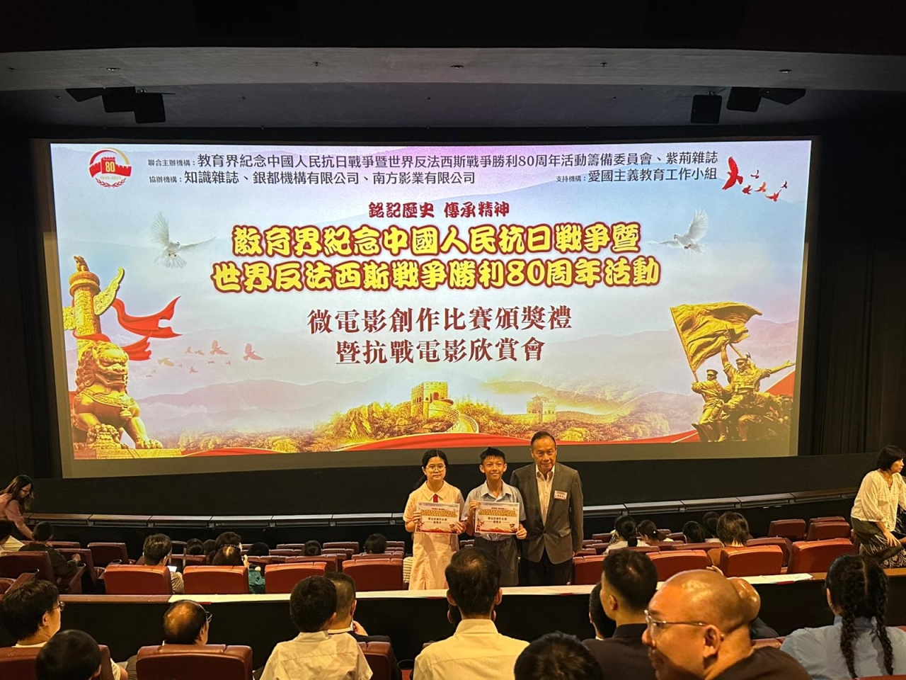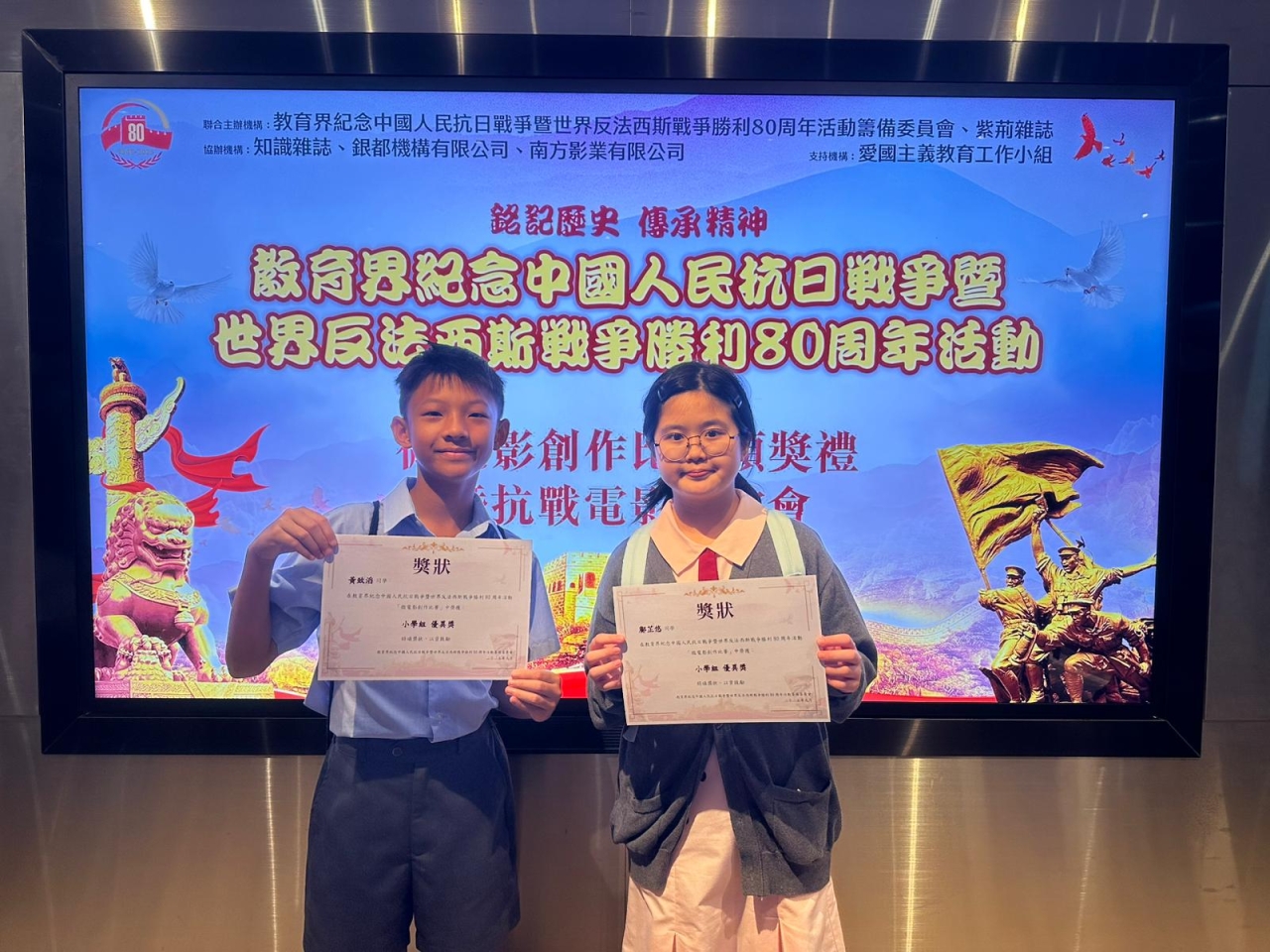 我校6C鄺芷悠同學和6D黃致滔同學在香港教育工作者聯會主辦之「銘記歷史,傳承精神」教育界紀念中國人民抗日戰爭暨世界反法西斯戰爭勝利80周年活動微電影創作比賽中榮獲小學組優異獎。獲獎作品——《烽火印記:從香港到盧溝橋之青春尋跡》以學生視角深入探尋香港抗戰歲月的珍貴歷史,通過鏡頭串聯起香港與內地共同抗戰的動人故事。同學們實地走訪抗戰遺址,以當代青年的目光重新凝視歷史,傳承中華民族不屈不撓的抗戰精神,展現了新時代青年銘記歷史、薪火相傳的堅定信念,激勵更多人攜手共築民族復興的中國夢。