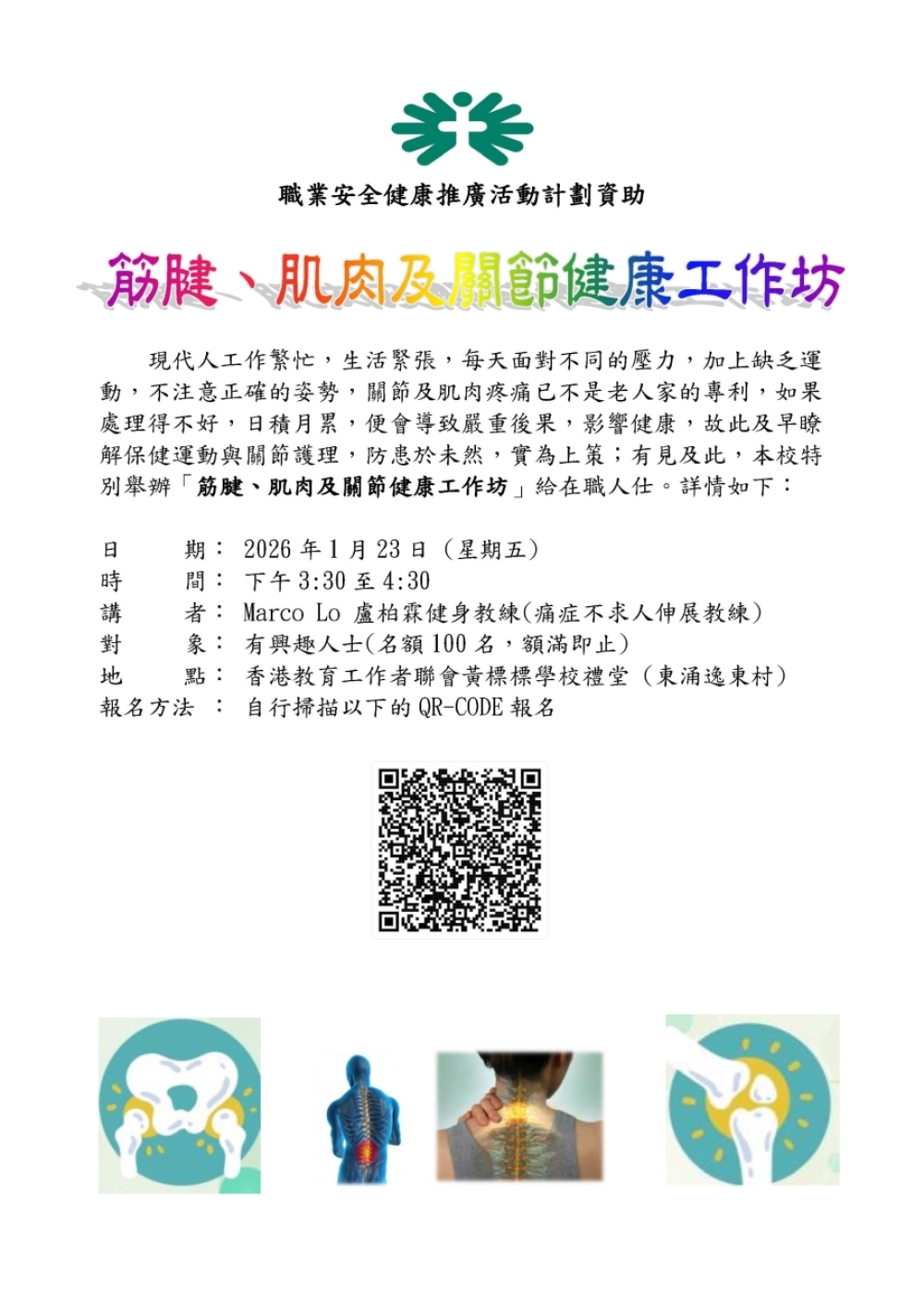 本校在1月23日下午3時半舉辧「筋腱、肌肉及關節健康工作坊」,歡迎有興趣的家長和在職人仕參加。