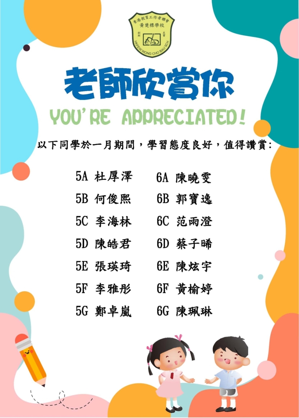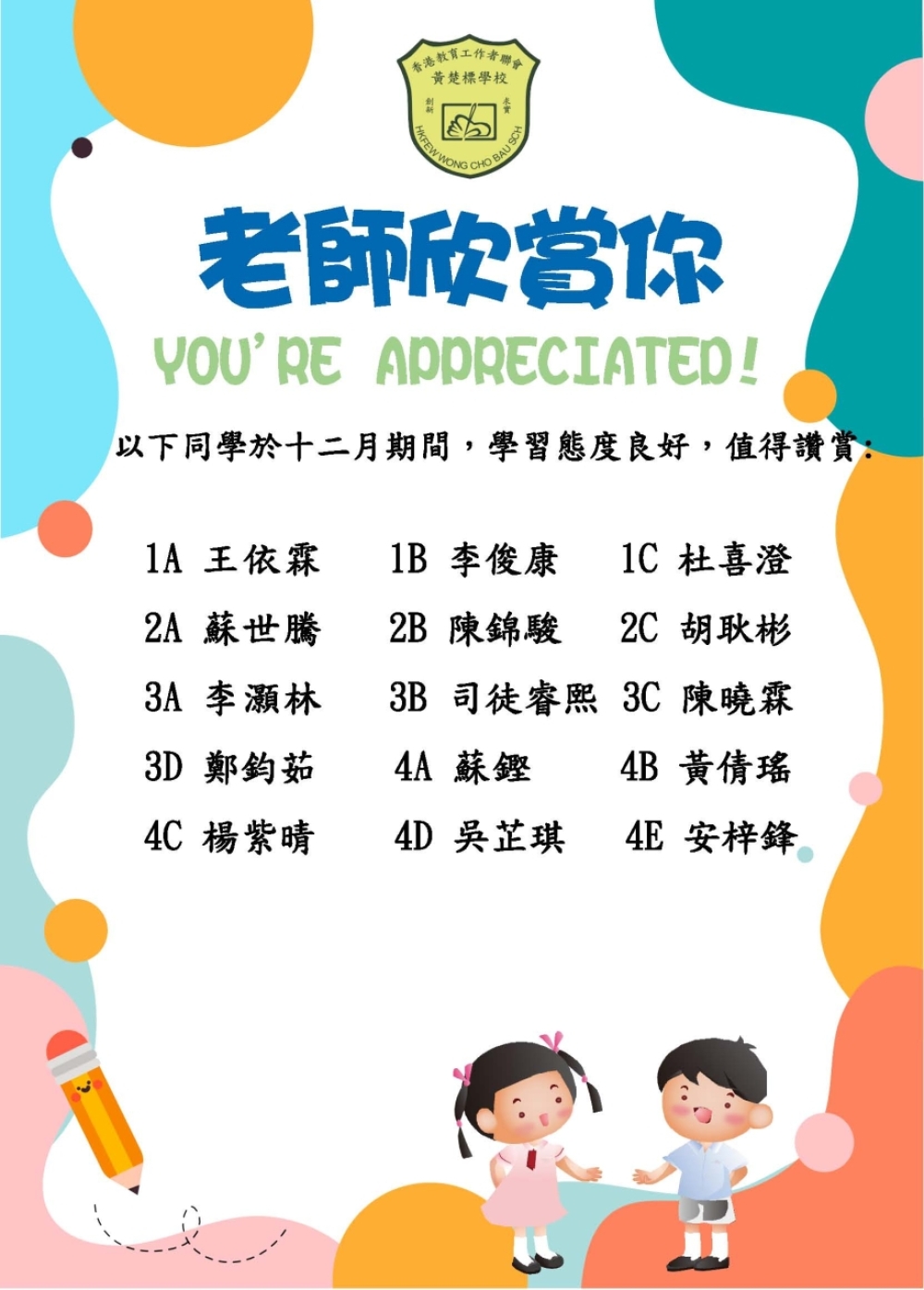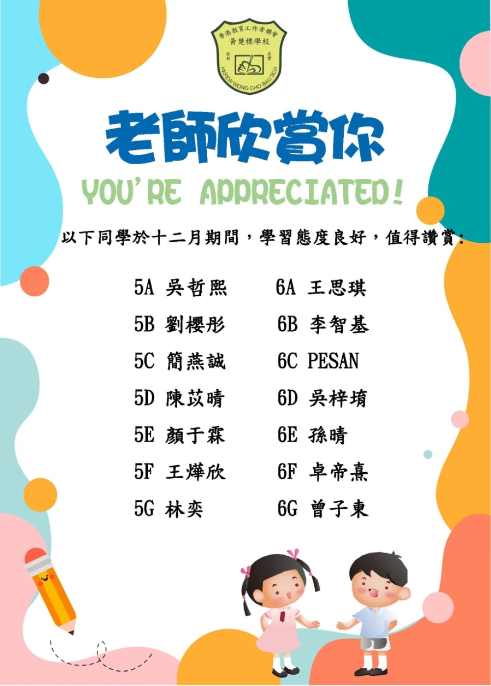 為營造欣賞文化,班主任或科任每兩週提名一位班內學習態度良好或有進步的學生。現公佈2022-2023學年12月及1月獲獎名單,以作表揚。