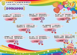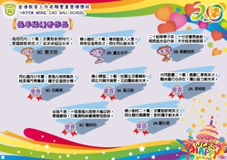 為了慶祝本校創校20周年,本校舉辦親子標語(Slogan)創作比賽。期望透過本活動,讓家長及學生共同分享校慶的喜悦。 評審團已選出得獎者,結果如下﹕