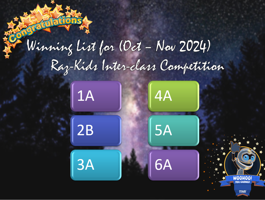 Congratulations to our winners in the competition. We hope all students enjoy reading e-Books on Raz-Kids.