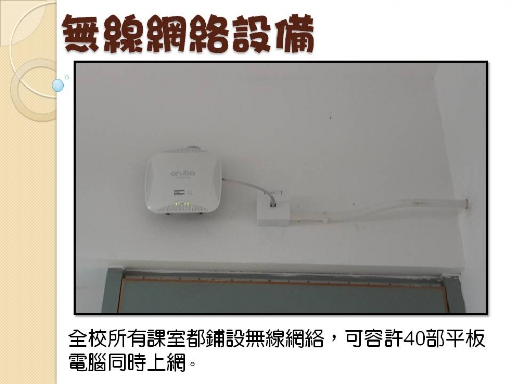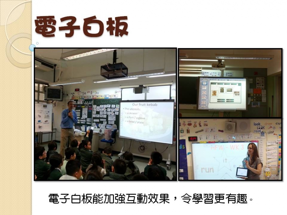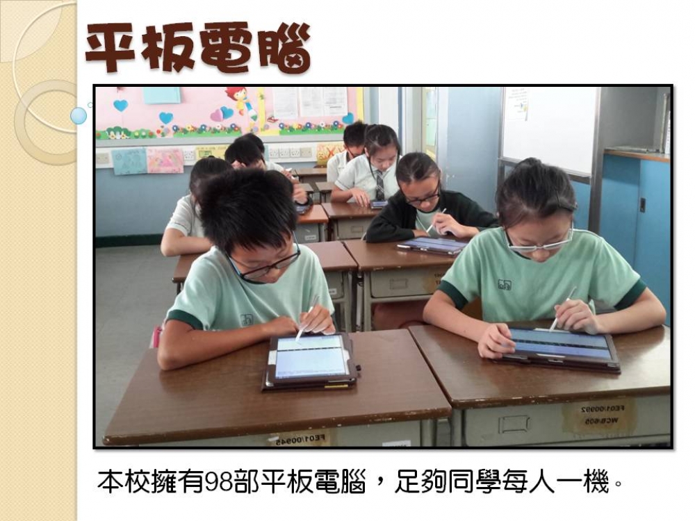 本校在所有的課室﹑及特別室均安裝了無線網絡,配合平板電腦及互動的電子白板,打做電子互動教室,除增加學生的學習興趣外,亦增加教學效能。