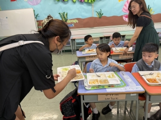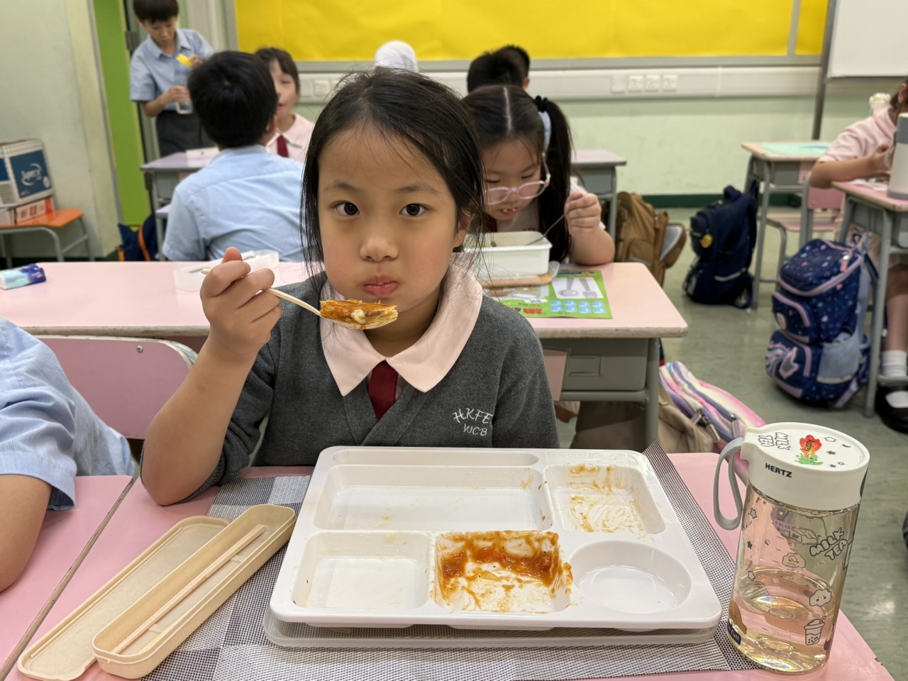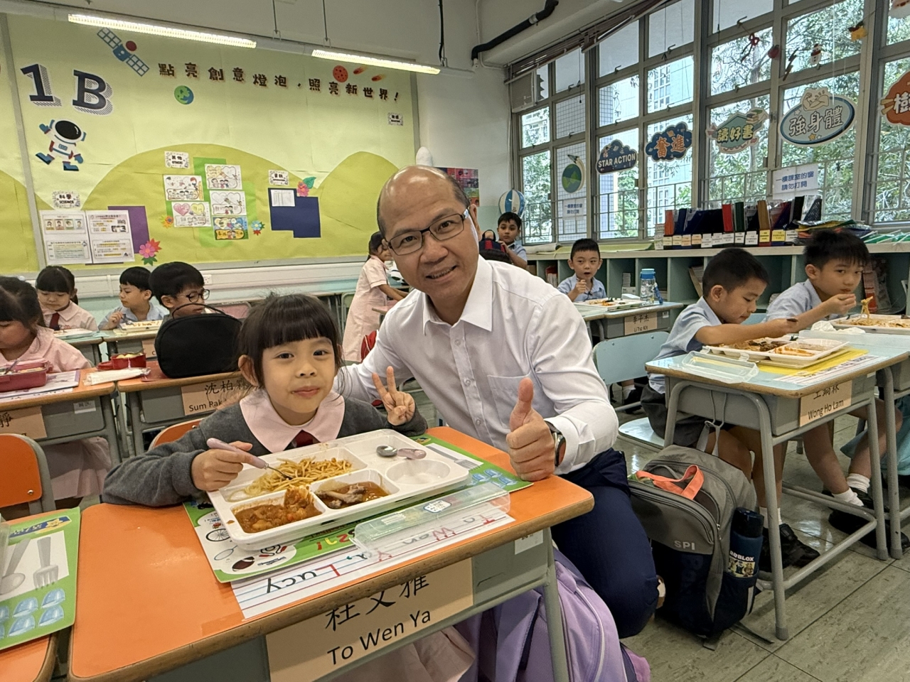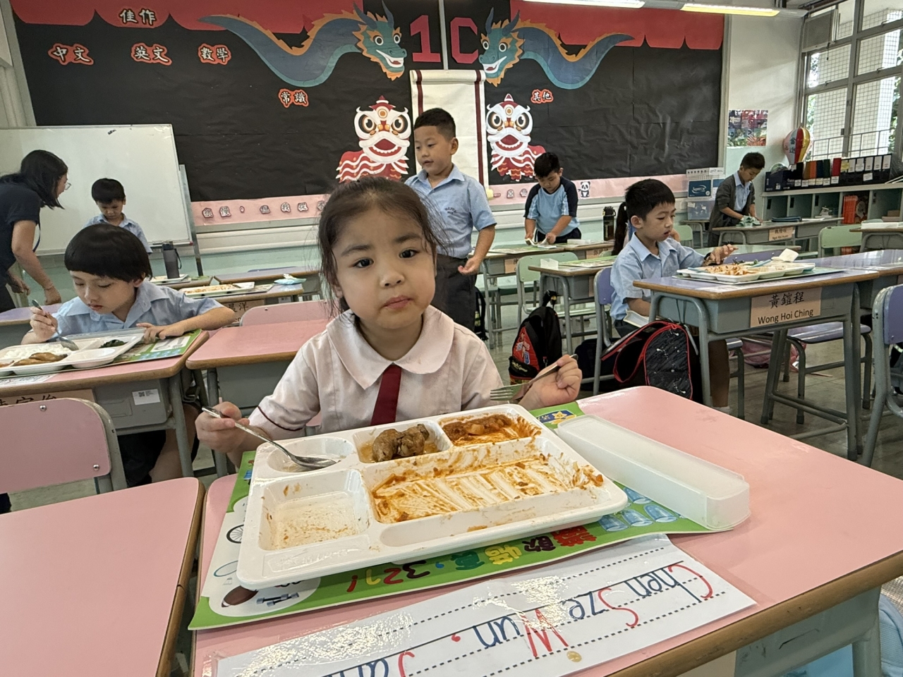 本校今年實行「惜飲惜食」計劃,目的是希望學生能珍惜食物。計劃實行了一星期,透過老師的觀察,同學們均能珍惜食物,即使是一年級的學生,也能積極參與。家長義工們的協助,令計劃順利展開。今天,黃校長還特意到各個課室及飯堂巡視,了解學生午膳情況,並為學生「添飯」呢!