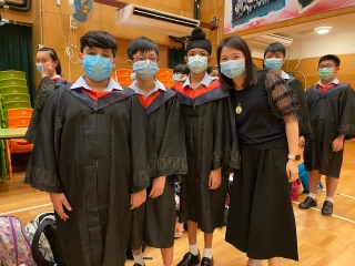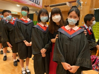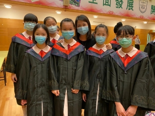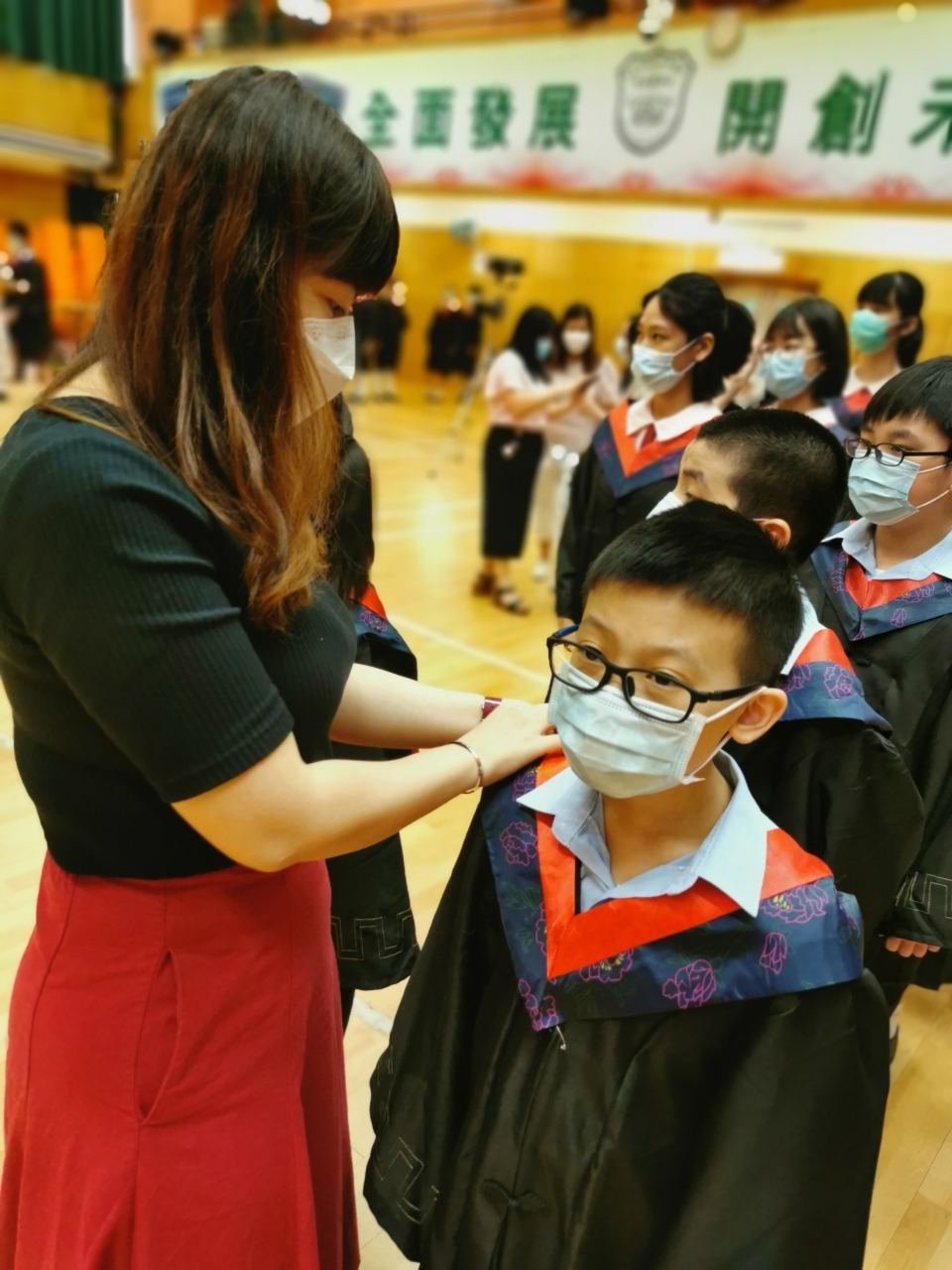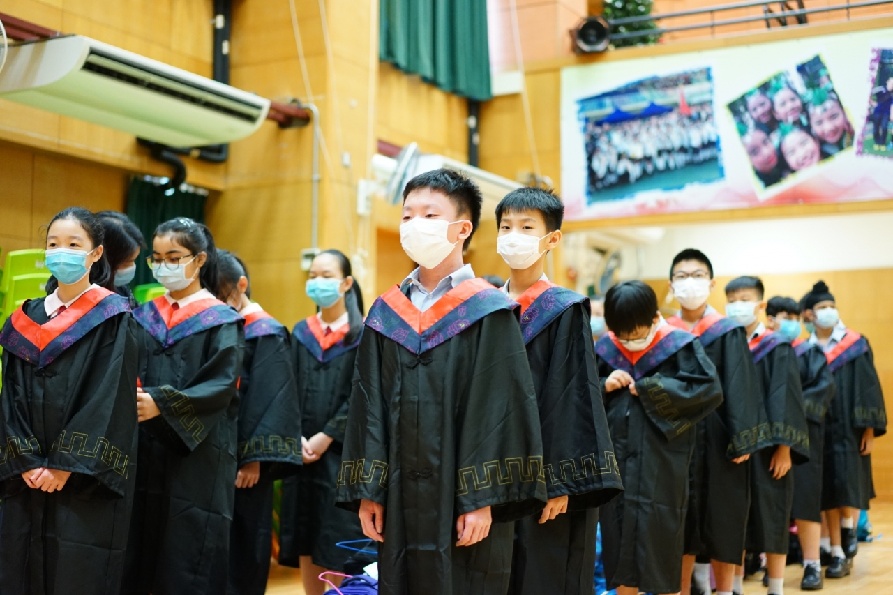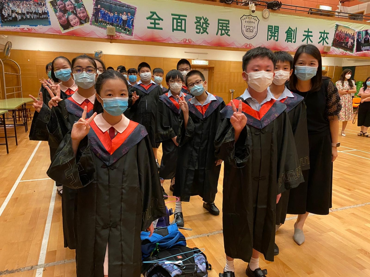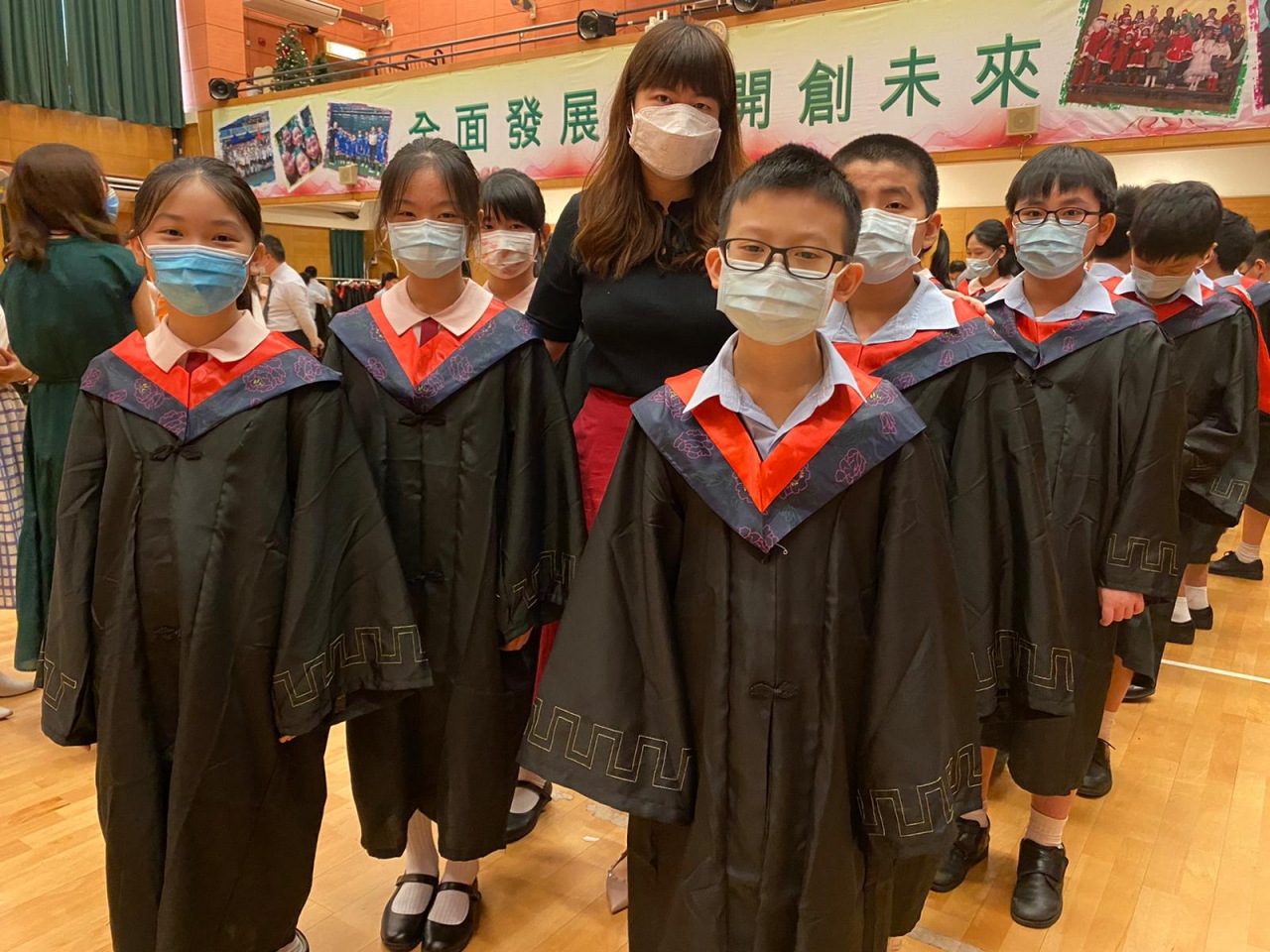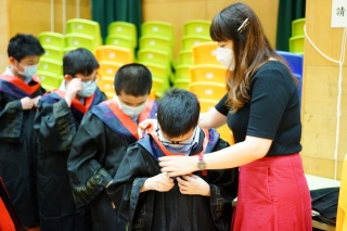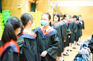 今天,攝影公司職員專誠到校為六年級同學拍攝畢業照。準畢業生穿上筆挺的畢業袍,顯得格外神采飛揚;班主任細心為學生整理儀容,令禮堂內溫情洋溢;師生們摘下口罩的一瞬,綻放出久違了的燦爛笑容。疫情下,同學們經歷了漫長的停課期。雖然剛剛復課,卻畢業在即,師生們都百般滋味在心頭。就讓我們以這一幀相片,見證我們在疫情下成長的一年。