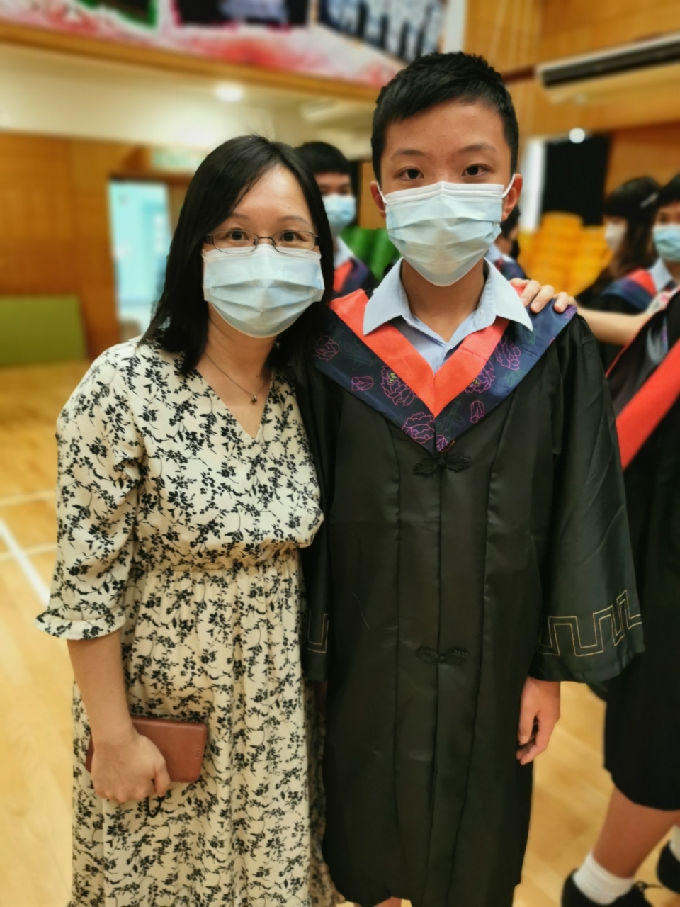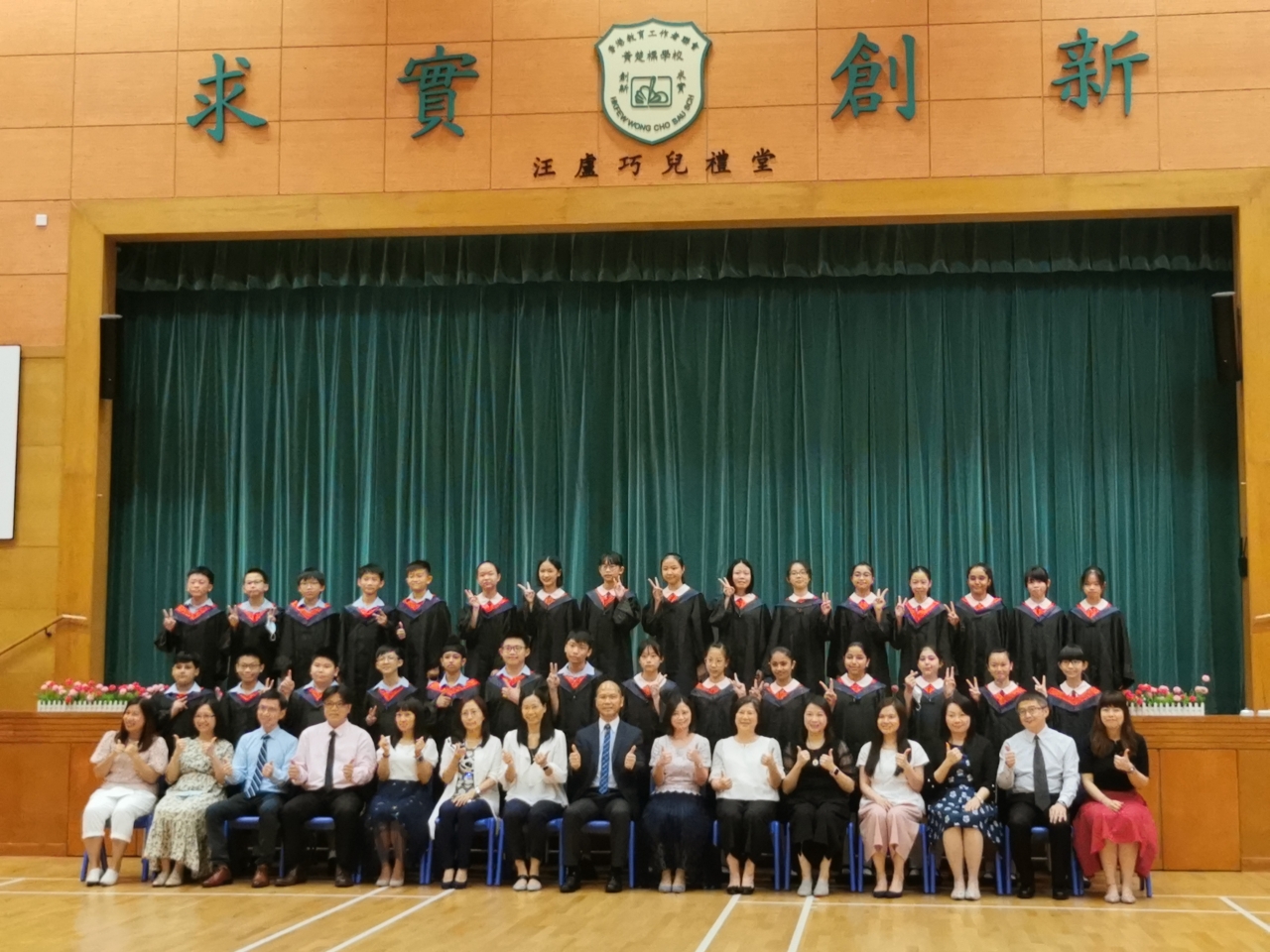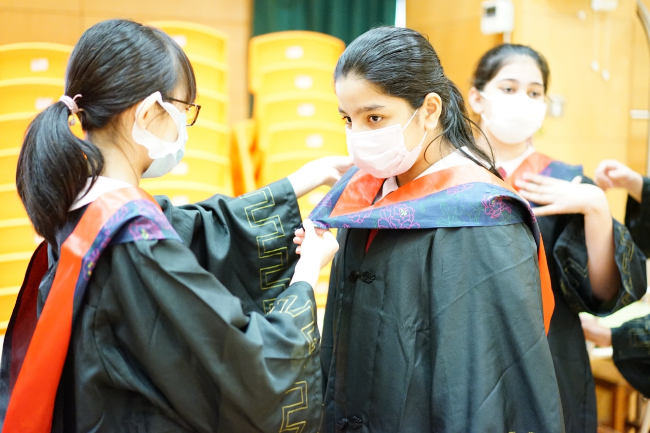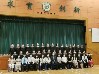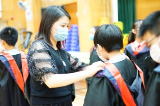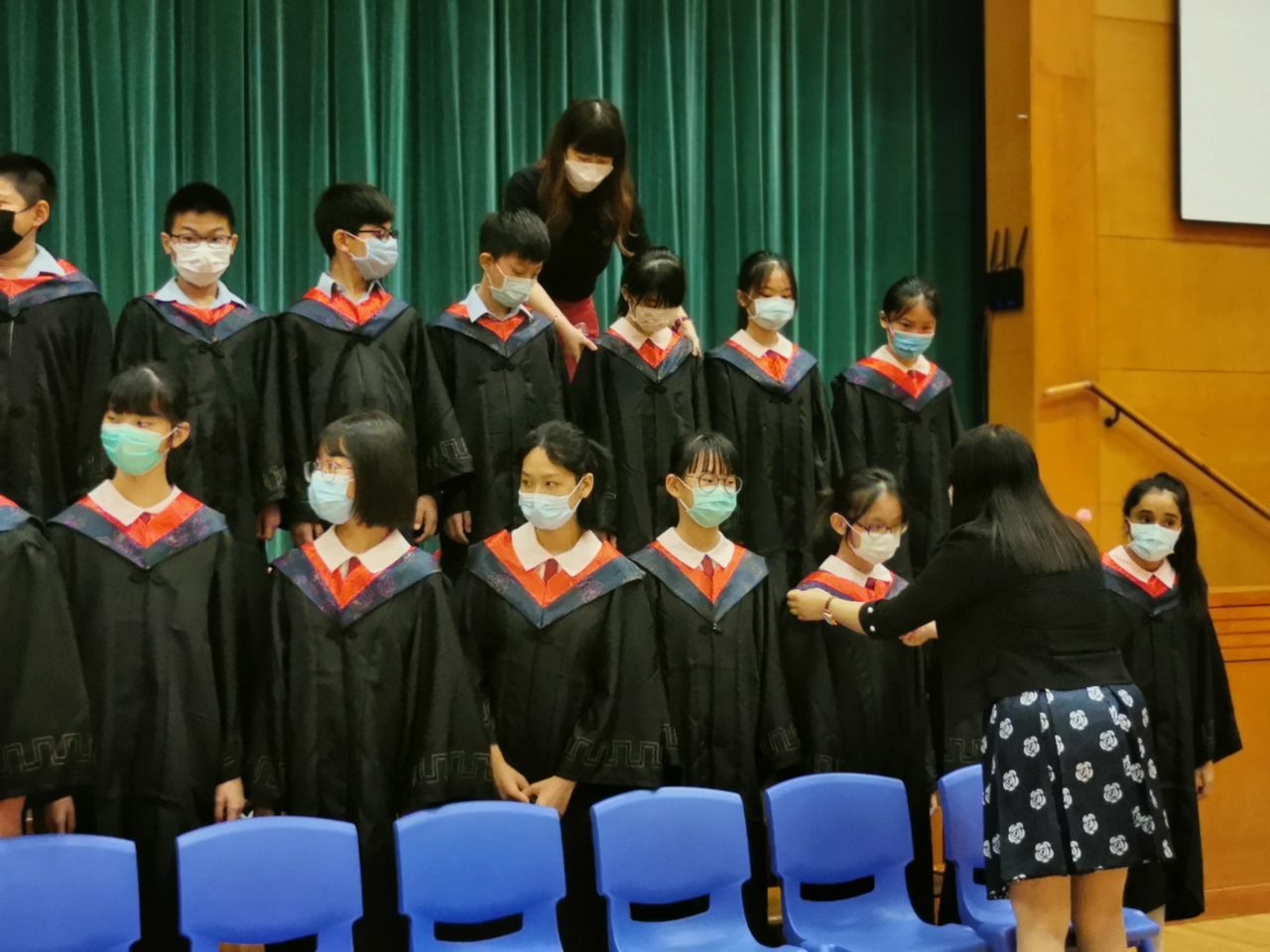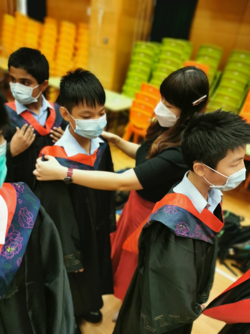 今天,攝影公司職員專誠到校為六年級同學拍攝畢業照。準畢業生穿上筆挺的畢業袍,顯得格外神采飛揚;班主任細心為學生整理儀容,令禮堂內溫情洋溢;師生們摘下口罩的一瞬,綻放出久違了的燦爛笑容。疫情下,同學們經歷了漫長的停課期。雖然剛剛復課,卻畢業在即,師生們都百般滋味在心頭。就讓我們以這一幀相片,見證我們在疫情下成長的一年。