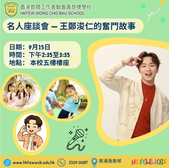 香港教育工作者聯會黃楚標學校家長教師會有幸邀請演藝界知名人士王鄭浚仁先生與學生進行座談。想了解更多王鄭浚仁的奮鬥經歷和認識更多培育子女的方法,快來報名吧!