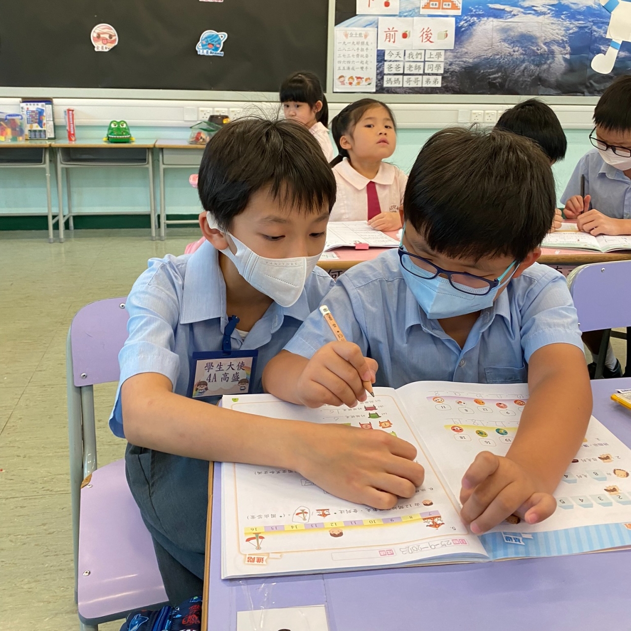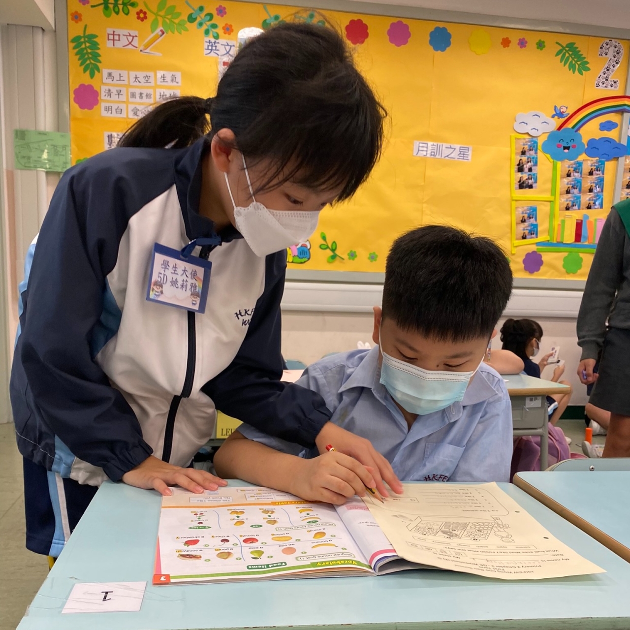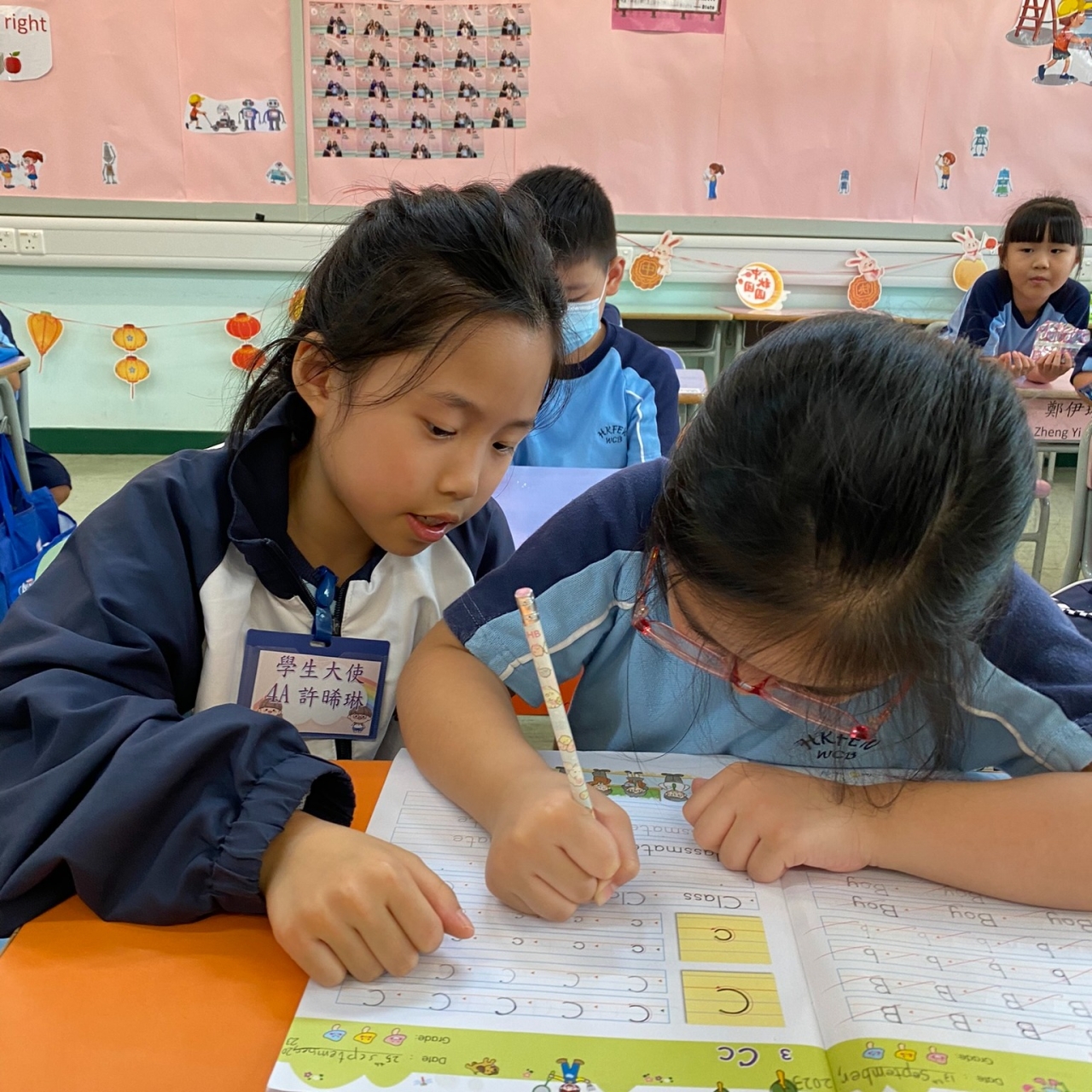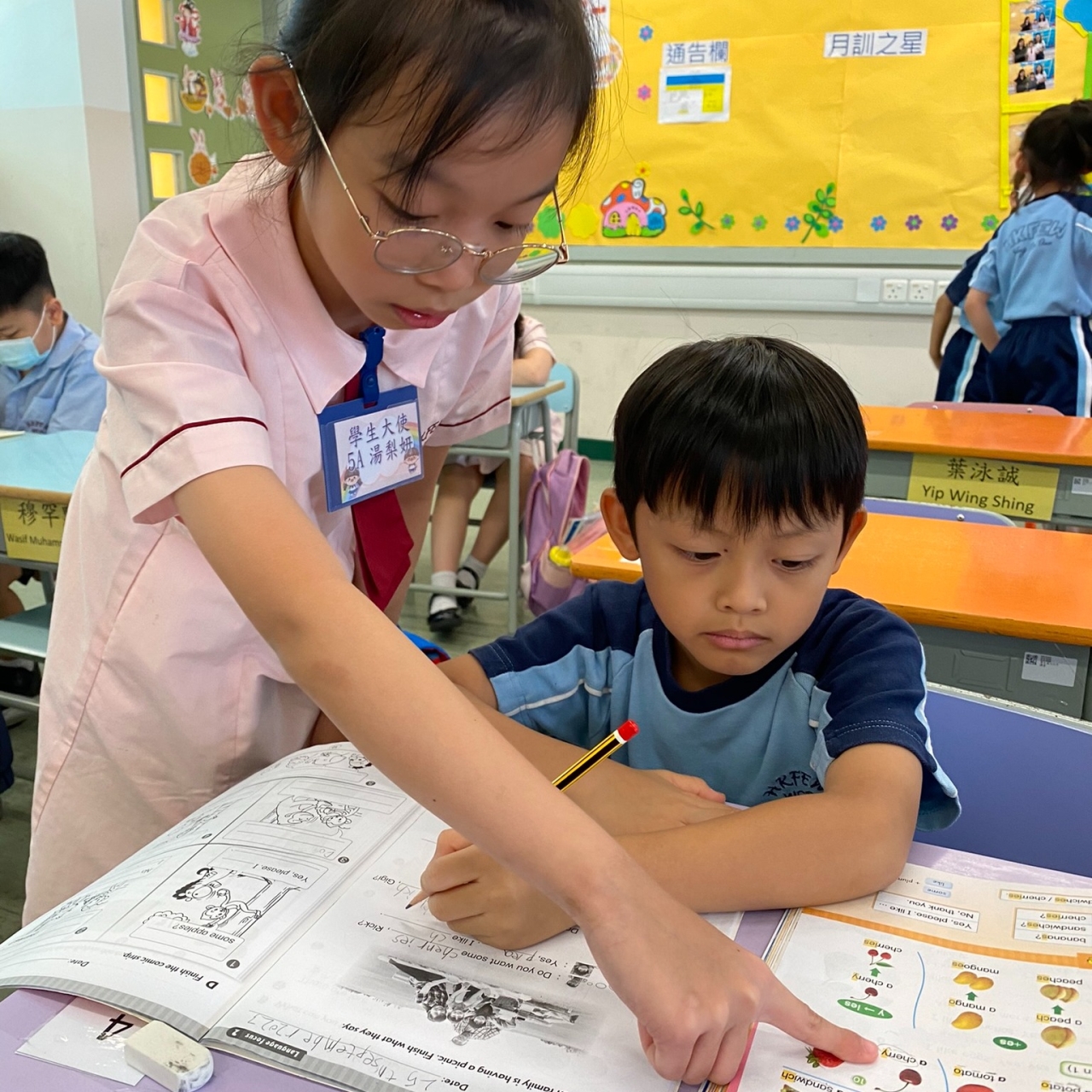 為協助小一小二適應開學初期的校園生活,學校安排高年級的學生大使於小息時協助學弟學妹認識常規、寫手冊及完成功課。