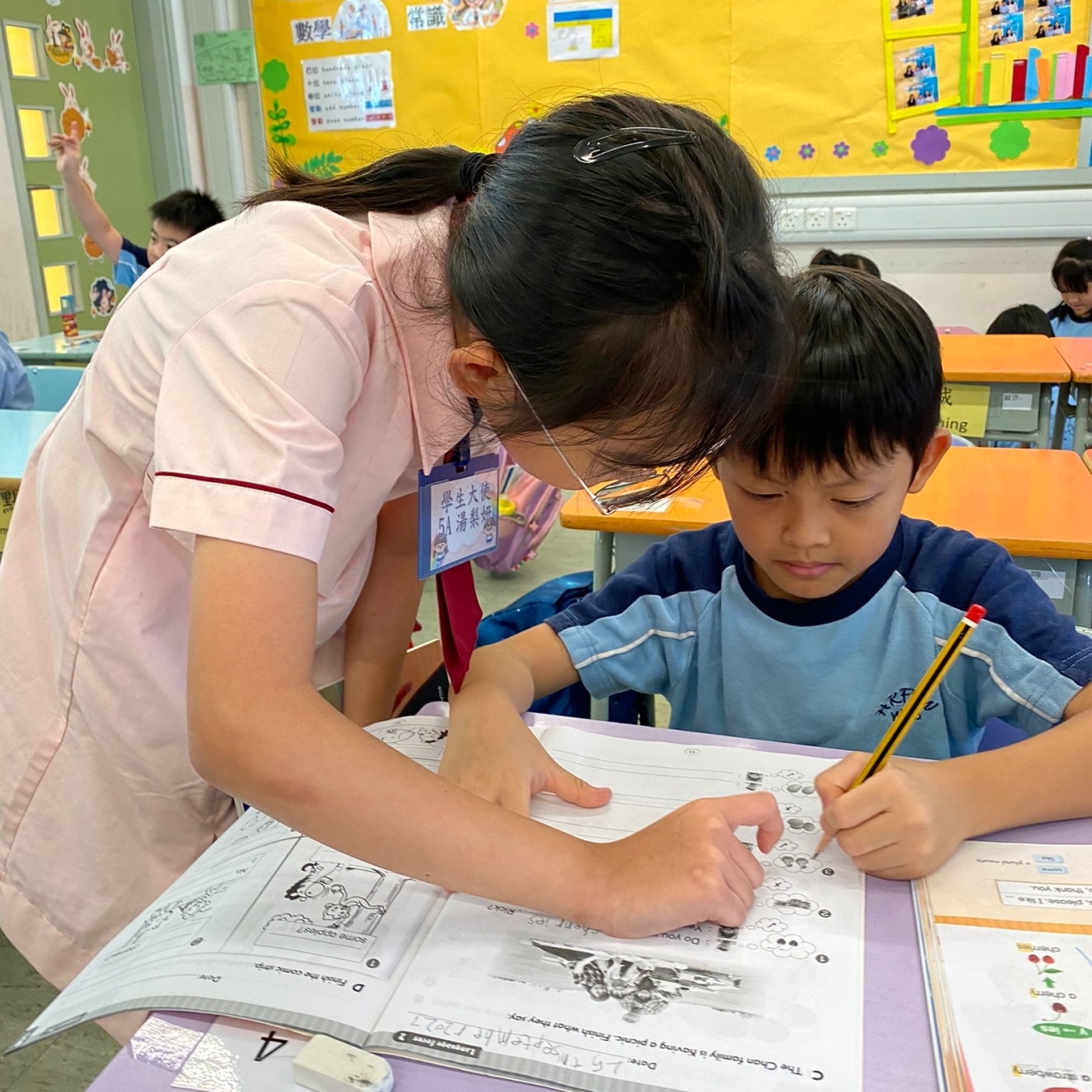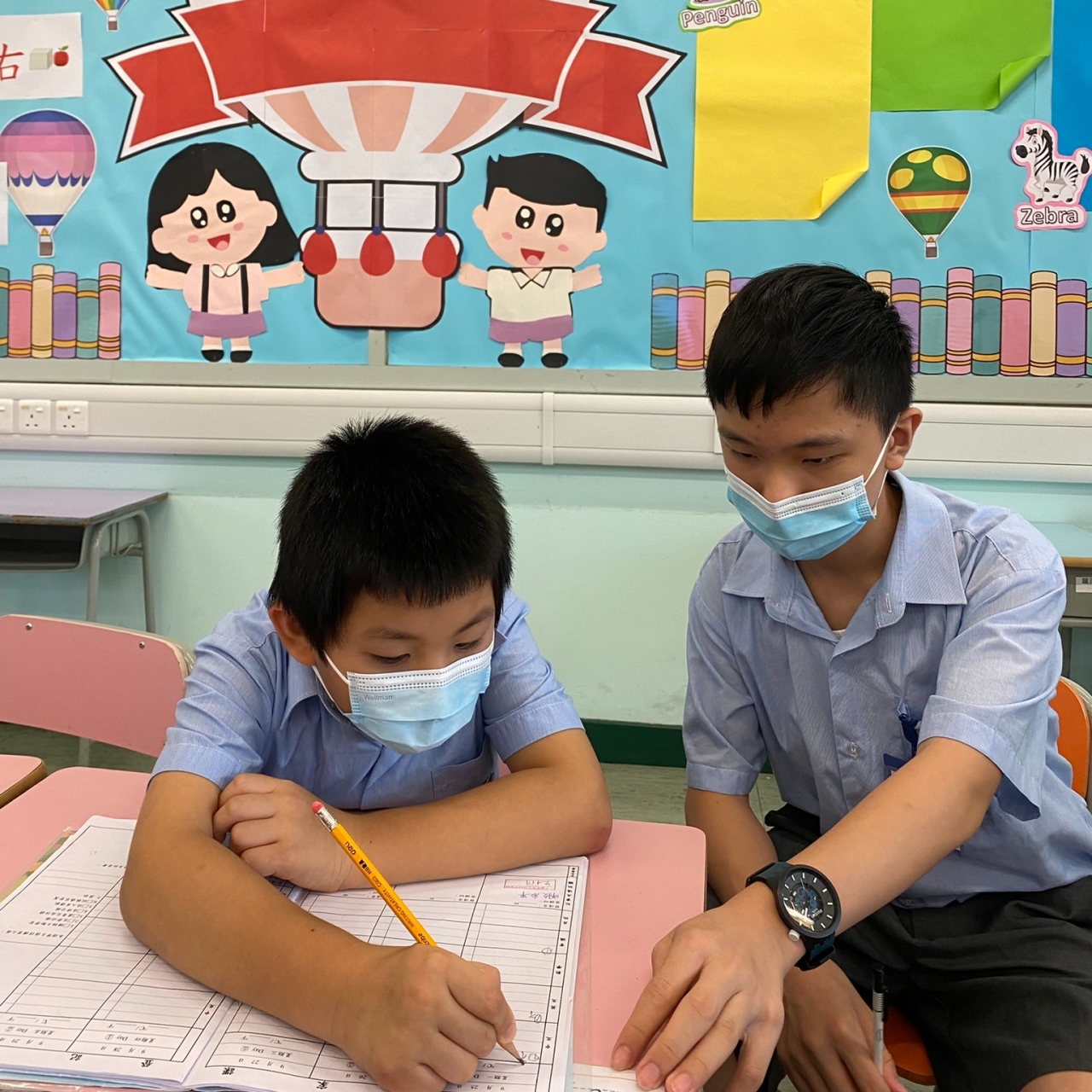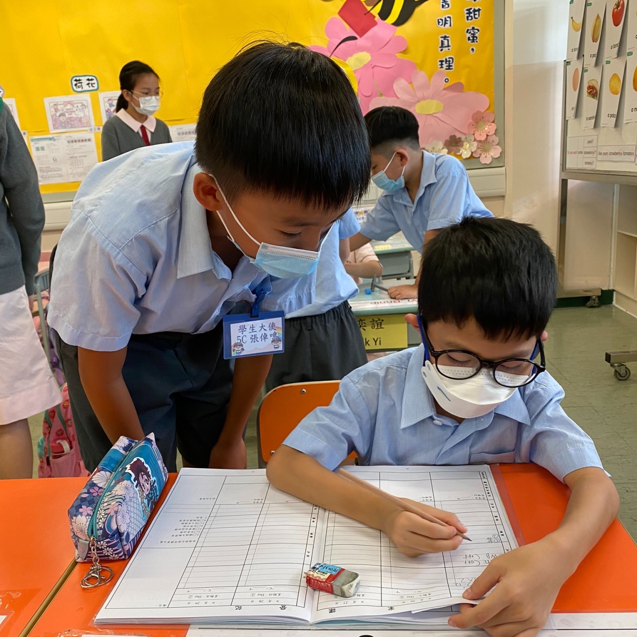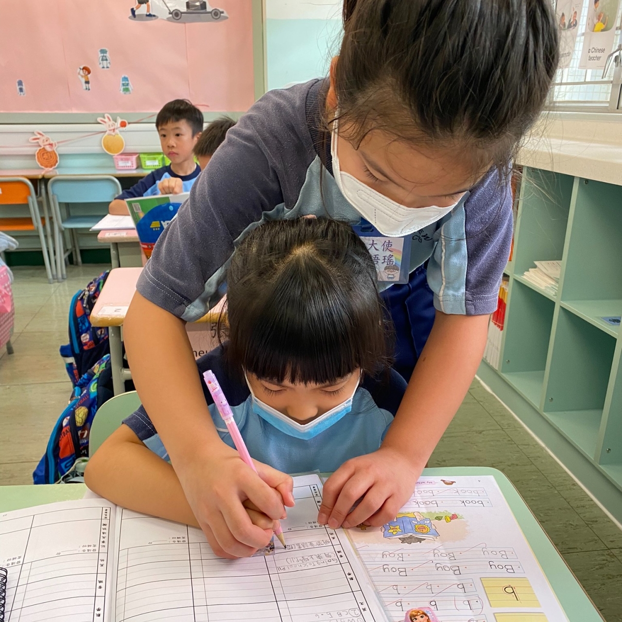 為協助小一小二適應開學初期的校園生活,學校安排高年級的學生大使於小息時協助學弟學妹認識常規、寫手冊及完成功課。