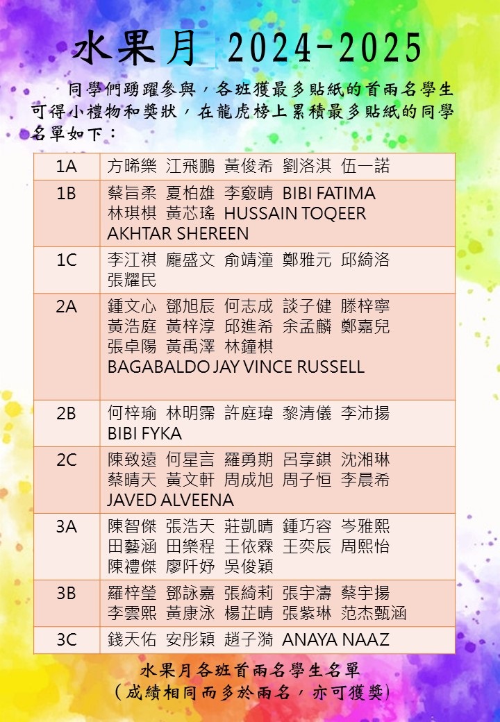 本校於5月7日至5月27日舉辦「水果月 2024-2025」活動,並安排同學進食水果後記錄在水果月龍虎榜上,以鼓勵學生培養每天吃充足水果的習慣。同學們都積極參與,表現相當理想。