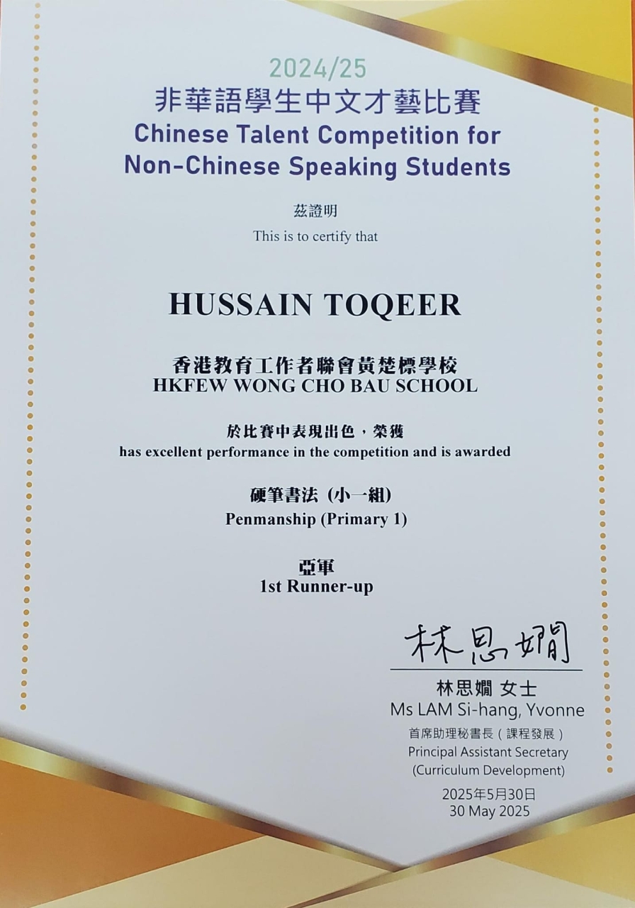 本校學生 1B HUSSAIN TOQEER(夏杜奇)榮獲教育局主辦的「2024/25非華語學生中文才藝比賽」小一組硬筆書法比賽亞軍。