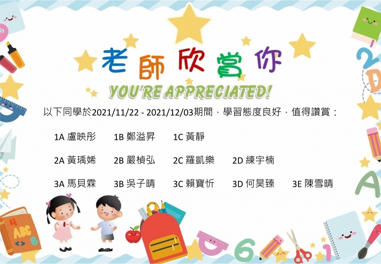 P1-3 『老師欣賞你』得獎名單 2021/11/22 - 2021/12/03
